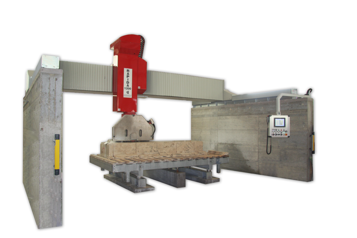 Die NOAT Drehkopf Brückensäge RAPIDA 1200 ist eine reine CNC Brückensäge für Kunden die keine Fräsarbeiten ausführen wollen, mechanisch ist sie mit der Drehkopf Brückensäge SFERA 1200 identisch. Sie wird auf Beton oder Stahlfundamenten montiert. Die Elektronik und Software entspricht die der Drehkopf Brückensäge QUBO.