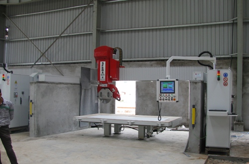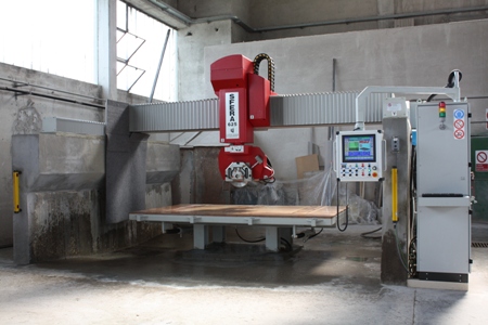 Die Drehkopf Brückensäge Maschine ist ideal zum Schneiden von Platten (Granit, Marmor, Kalkstein und andere Naturseine) und sogar unregelmäßig Stücke, durch die schnelle Drehung des Kopfes um 360°, auch die Verwendung von Fräswerkzeugen auf Konus ISO 40 ist möglich, mit Nutzung der CAD-CAM Software und 5 interpolierten Achsen.