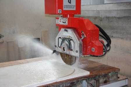 Die Drehkopf Brückensäge Maschine ist ideal zum Schneiden von Platten (Granit, Marmor, Kalkstein und andere Naturseine) und sogar unregelmäßig Stücke, durch die schnelle Drehung des Kopfes um 360°, auch die Verwendung von Fräswerkzeugen auf Konus ISO 40 ist möglich, mit Nutzung der CAD-CAM Software und 5 interpolierten Achsen.